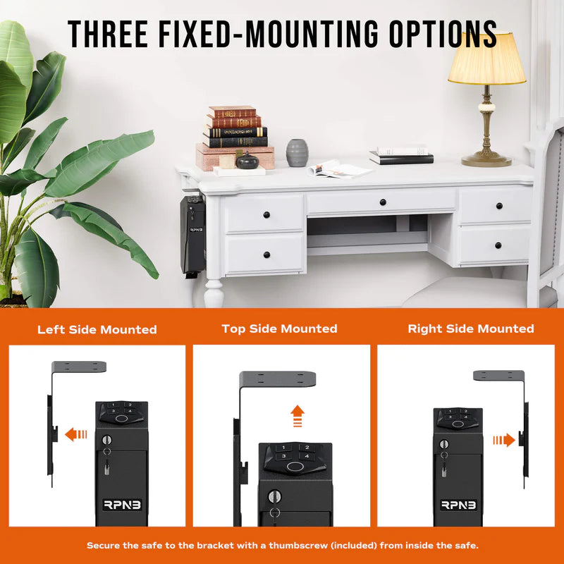 Need a quick way to keep your handgun safe and secure? Check out this RPNB fingerprint nightstand gun safe. You can use the smart biometric fingerprint scanner, digital keypad or manual lock keys for access. User-friendly design makes it easy to open even for a single hand. Also it's easy to install and program. Only need a few seconds to mount it under a desk or nightstand with the mounting bracket. For added convenience, mountable from right, left, or top side, depending on desired preference.