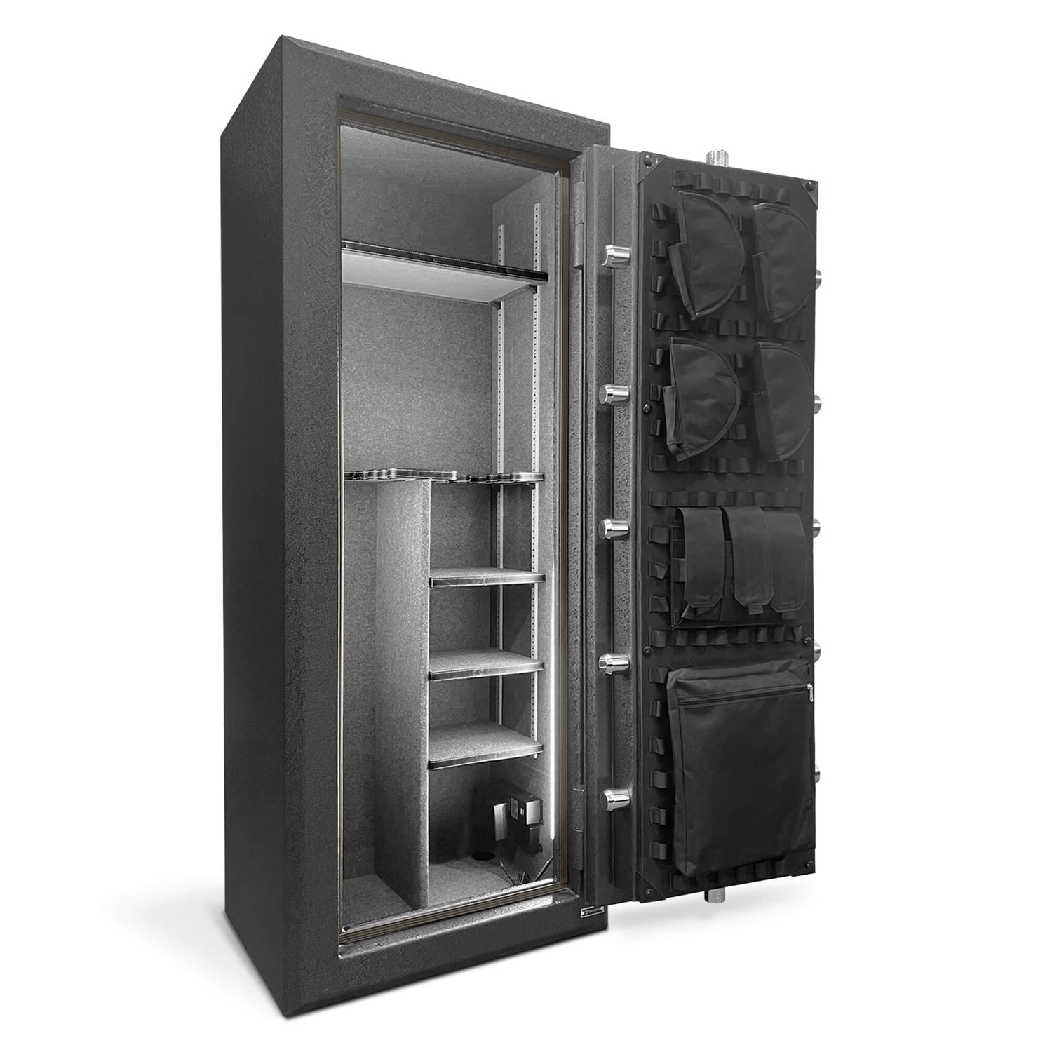 Unique to Stealth Gun Safes is the customizable Molle interior door organizer that helps free up additional space in the safe. This system is far better than sewn-in pockets as the system allows for full customization. Want your pistol holsters at the bottom of the organizer? No problem. Want them lined up on the right side? No problem. Want to get rid of all the included accessories and use your own? Again, no problem! You can add and remove accessories as you need with the convenient strap and snap system.